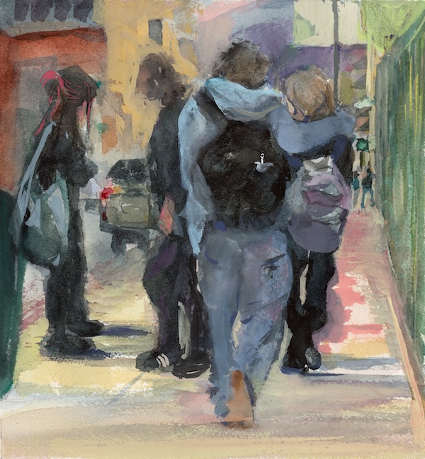 Teens in Old Pasadena, Watercolor and Gouache on Arches Oil Paper ~ 8.5” X 7.75